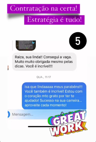 Isadora achava que seu currículo era bom, até entender o que os recrutadores realmente buscavam. Com o método da Raiza, ela superou a imaturidade profissional no papel, dominou as entrevistas e hoje indica de olhos fechados: “É um investimento que traz retorno financeiro, pessoal e emocional”.