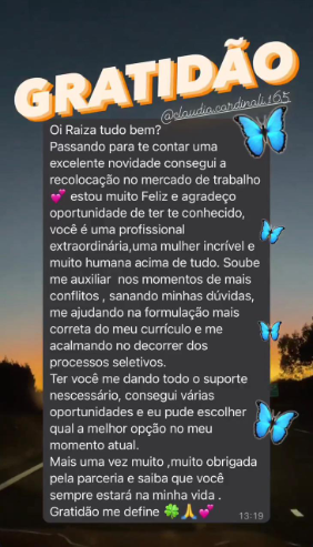 Ao longo da minha trajetória, já auxiliei mais de 2000 profissionais em sua jornada de recolocação e crescimento no mercado de trabalho.